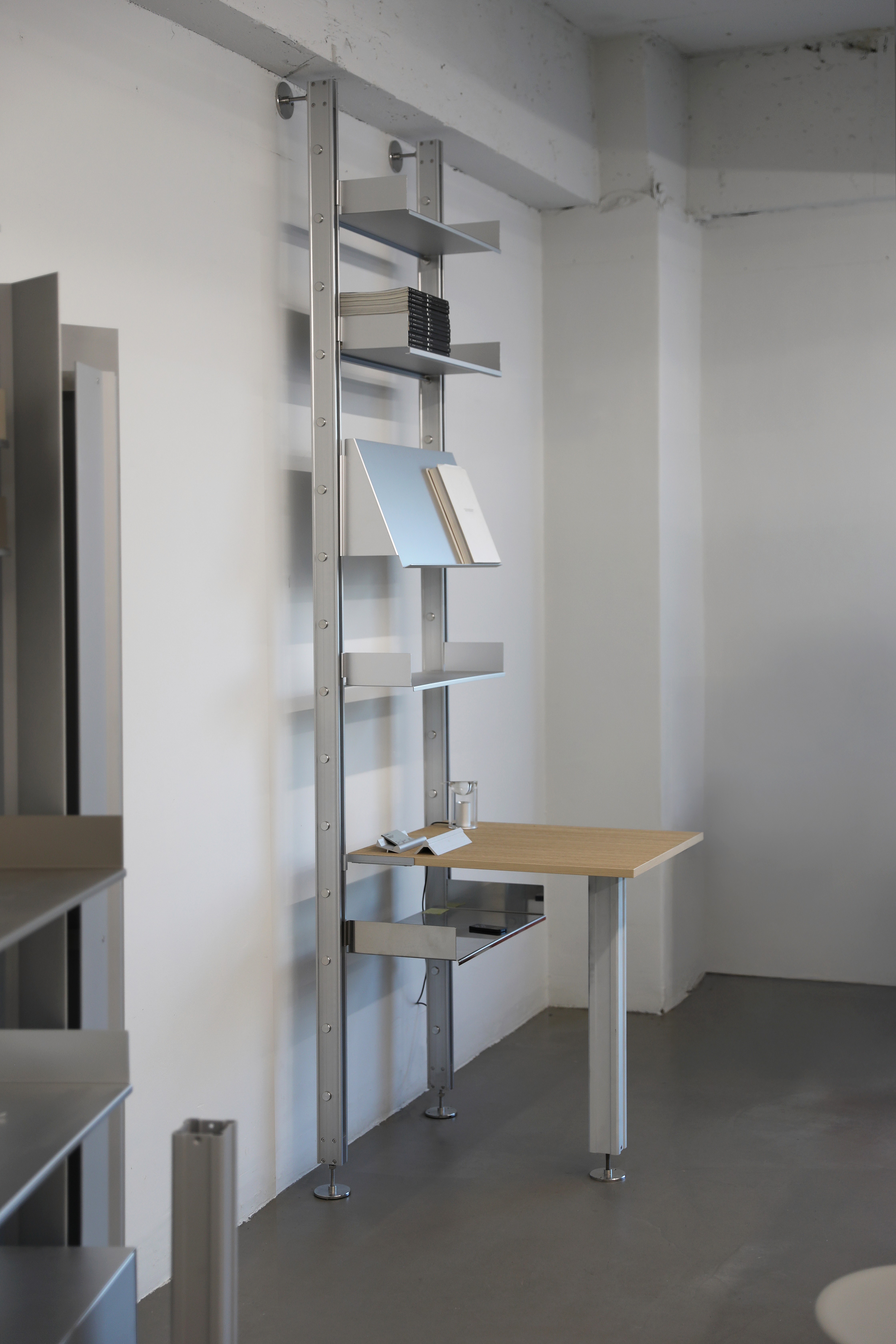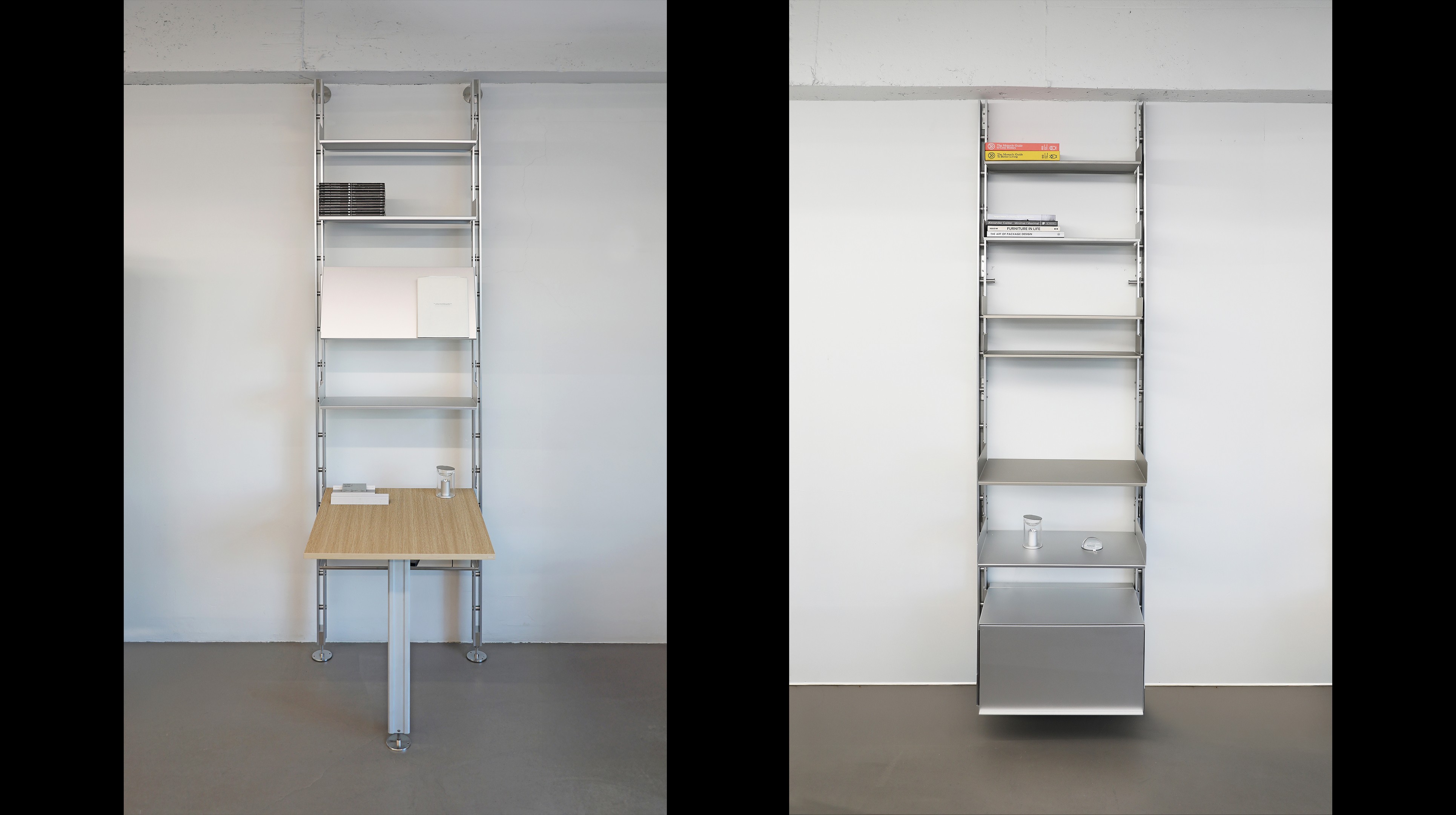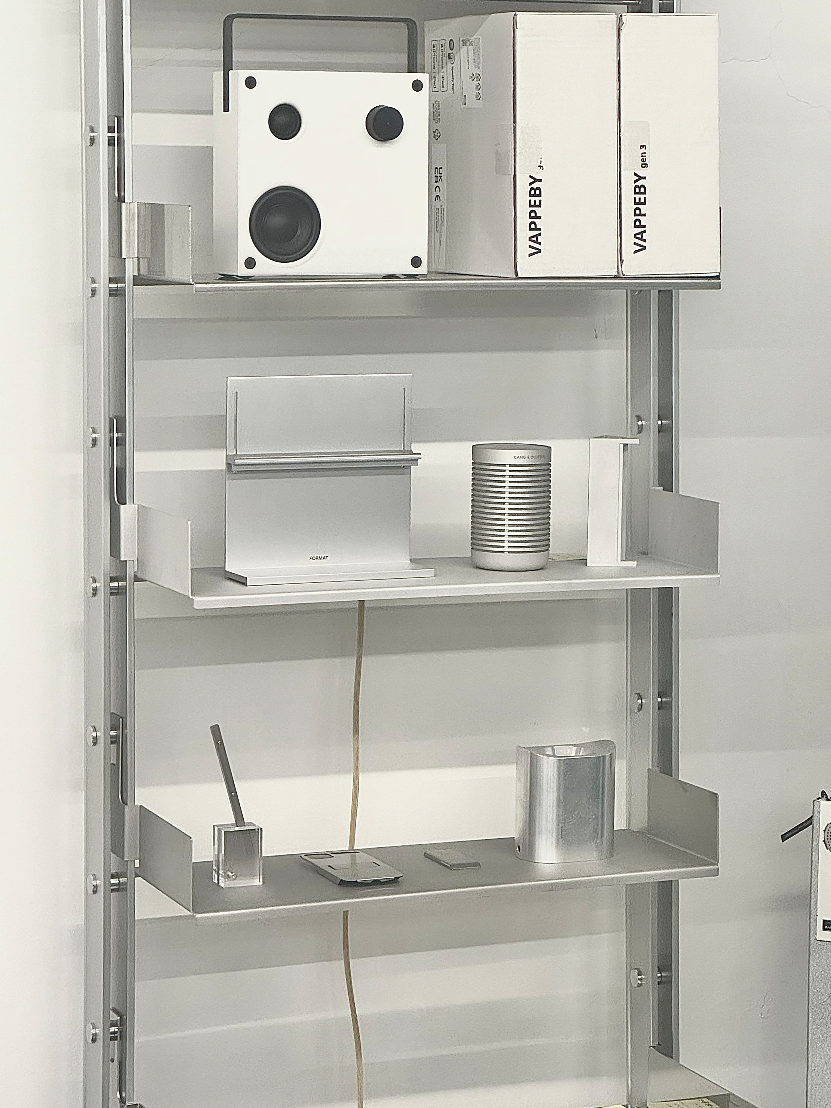 Rather than functioning as a fixed piece of furniture, the shelving system is designed to expand and be reconfigured according to changes in space and user needs. Components originally engineered for functional efficiency in industrial contexts are transformed into elements for everyday storage and display, while the rigid metal structure introduces a sense of order and calm within the space.