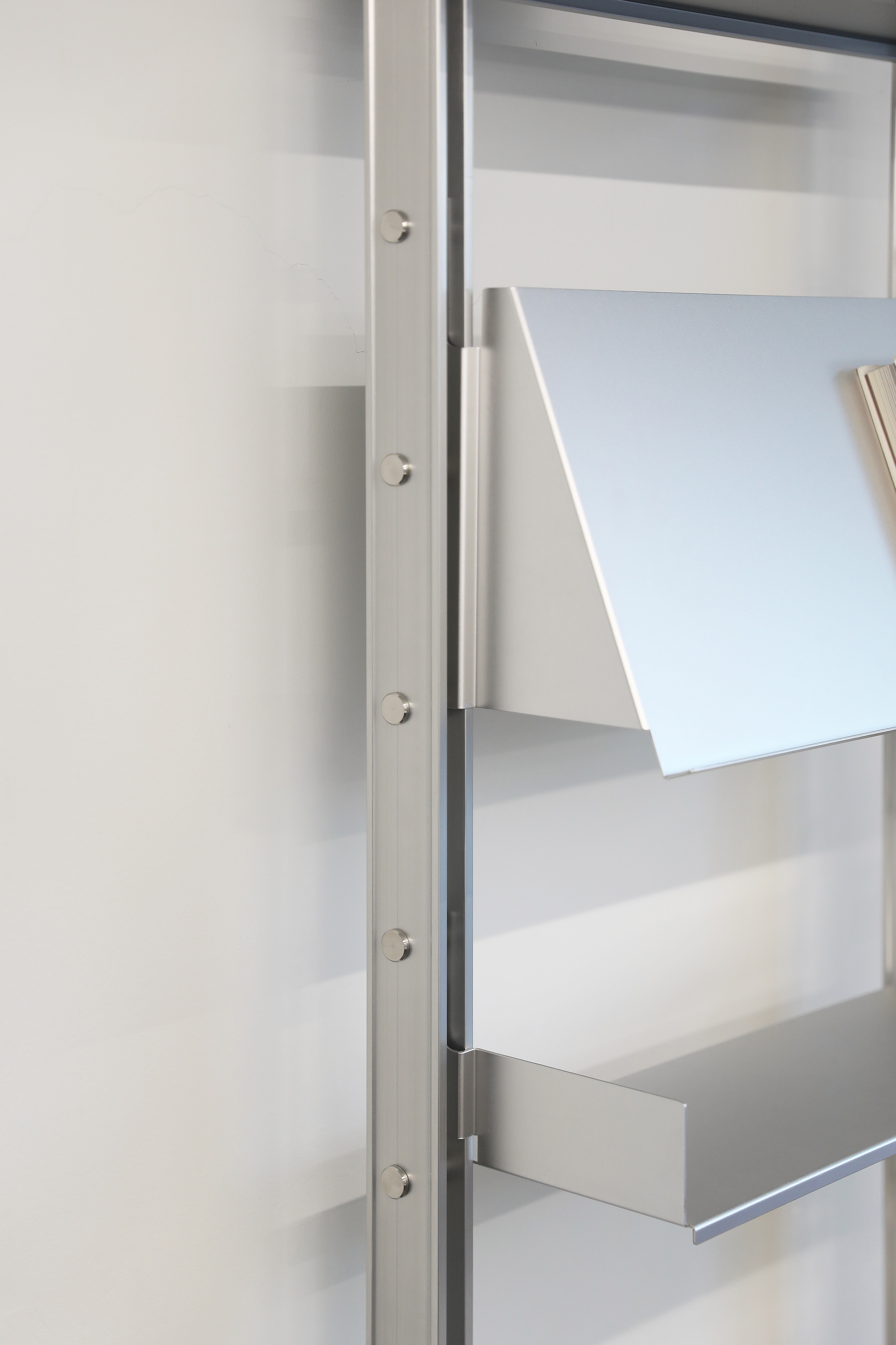 The third product in the collection is a system shelving unit. Standardized formwork components are disassembled, cut, and reassembled to form a modular system furniture piece. Drawing inspiration from the repetitive assembly and disassembly process of aluminum formwork used on construction sites, the design centers on a vertical rail structure, which serves as the core structural element of the shelving system. The shelf rails, derived from the original assembly logic of the formwork, along with newly developed brackets that anchor the system to the wall and floor, ensure both structural stability and visual clarity.