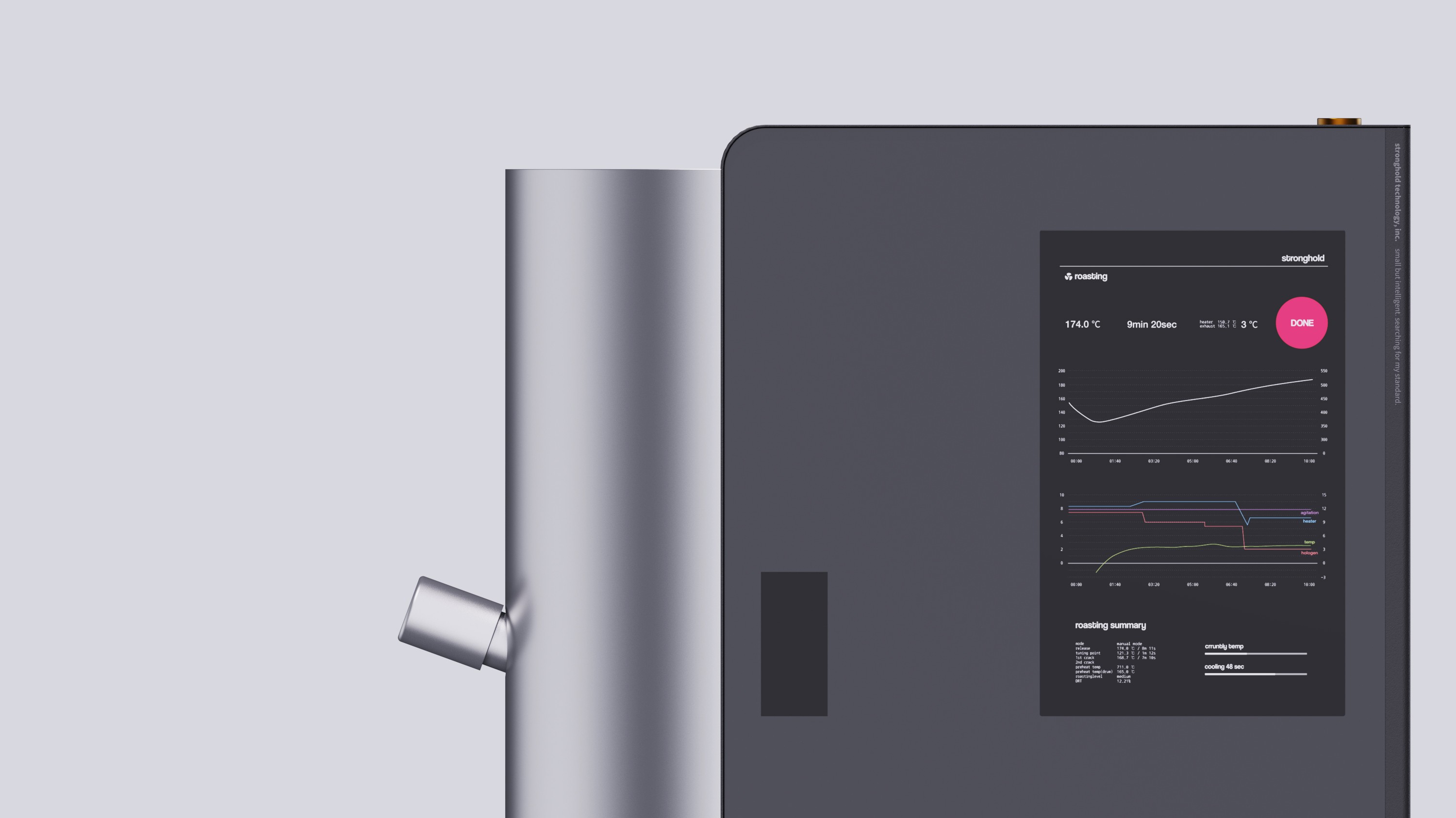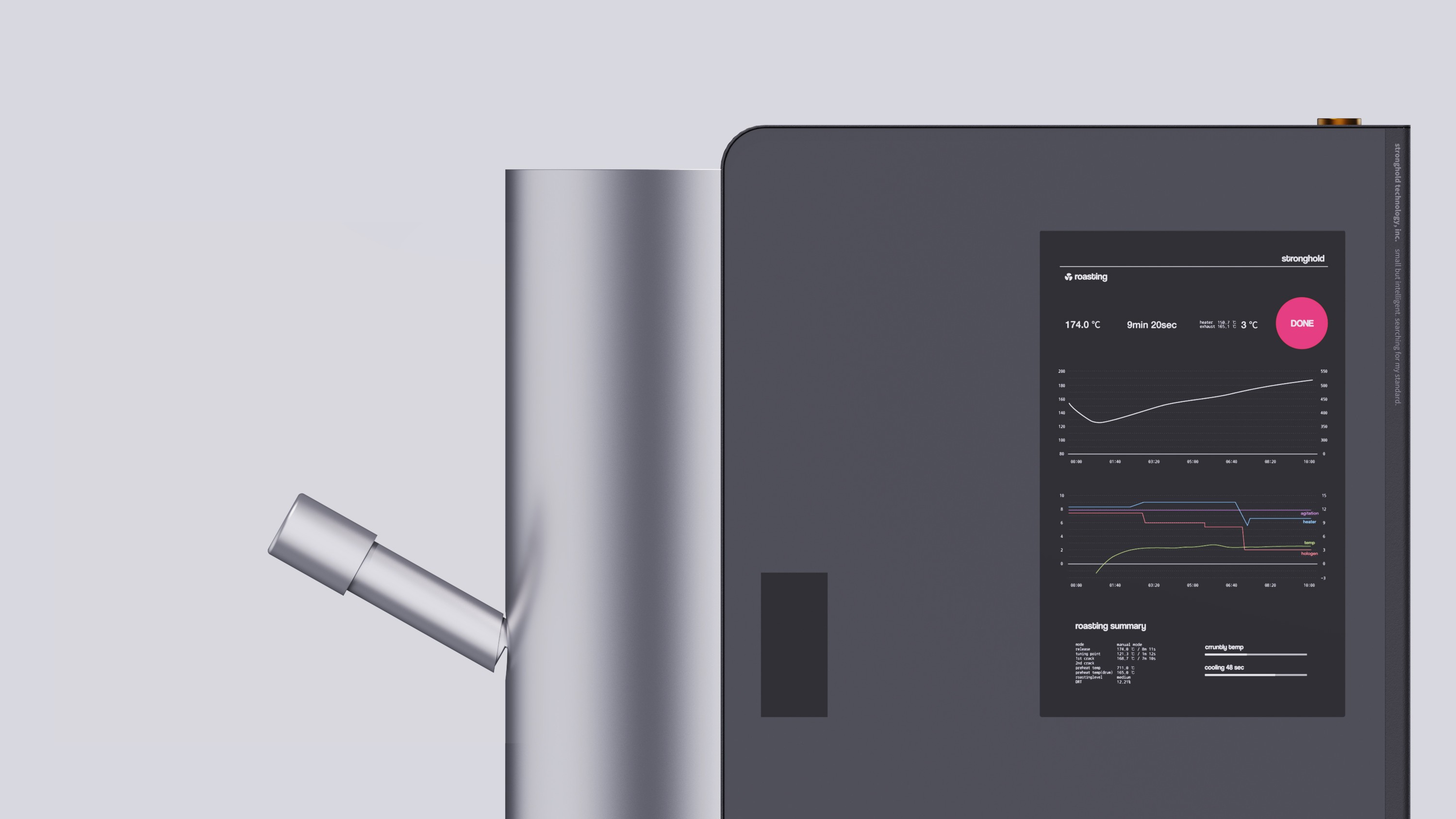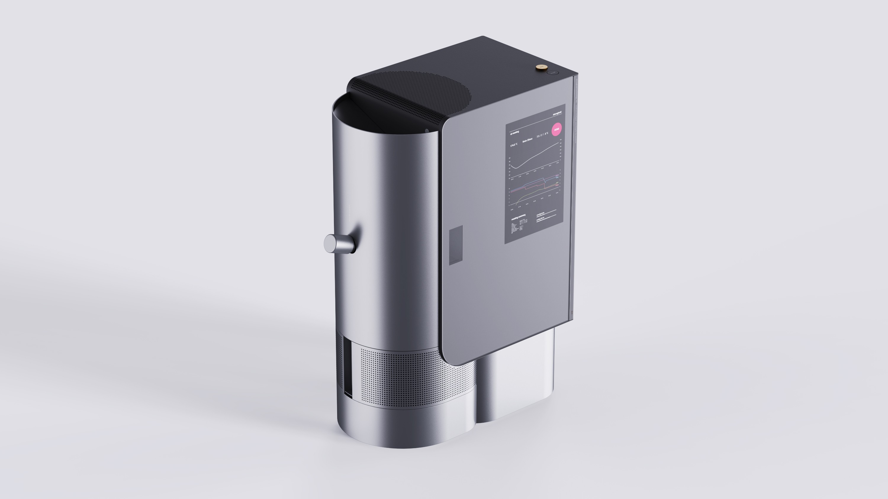 The cylindrical form—aligned with the design language of Stronghold’s existing roasters—was emphasized to create a consistent family look across the product line.